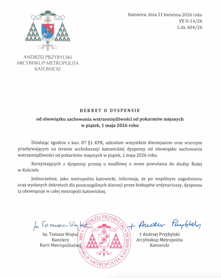 Arcybiskup Andrzej Przybylski udzielił dyspensy od obowiązku zachowania wstrzemięźliwości od pokarmów mięsnych w piątek 1 maja 2026 r.